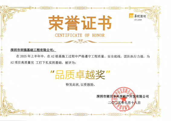 羅湖湖貝A2樁基礎工程榮獲“品質卓越獎”、“進度先進個人”及“資料綜合先進個人”
